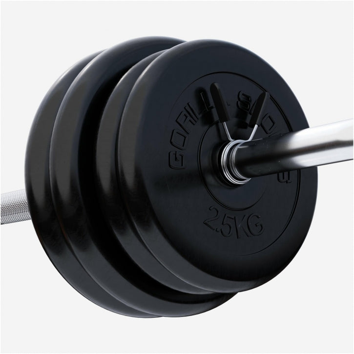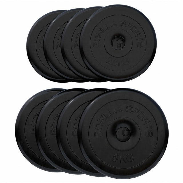 De medfølgende vægtskiver er fire 5 kg vægtskiver og fire 2,5 kg vægtskiver 30 kg, og alle med 8 mm tyk gummibelægning, der beskytter dit gulv mod skader og reducerer støj og beskytter dine vægte.