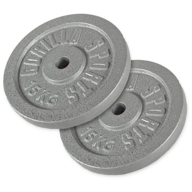 To 15 kg vægtskiver i støbejern og grå farve tilpasset vægtstang med en diameter på 30 mm.