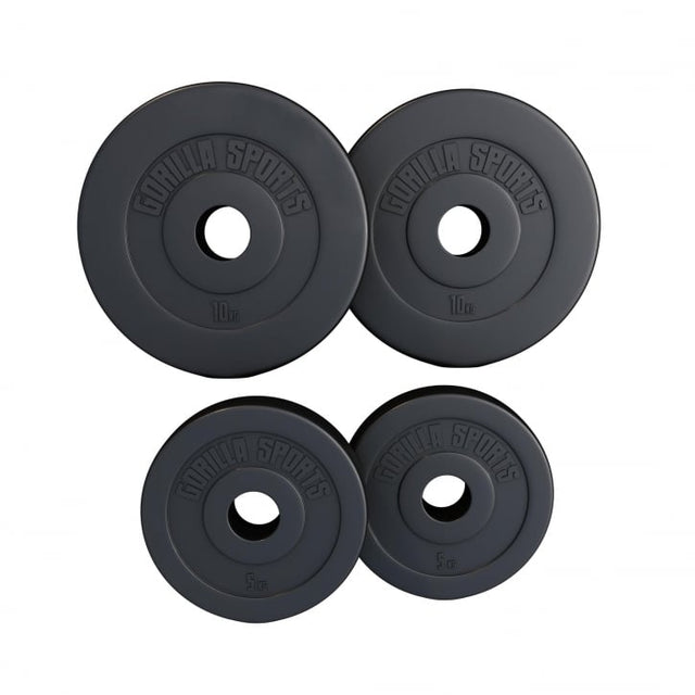 Denne pakke indeholder i alt fire vægtskiver i to forskellige vægte; 2x5 kg og 2x10 kg, som alle er lavet af cement med en beskyttende plastbelægning.