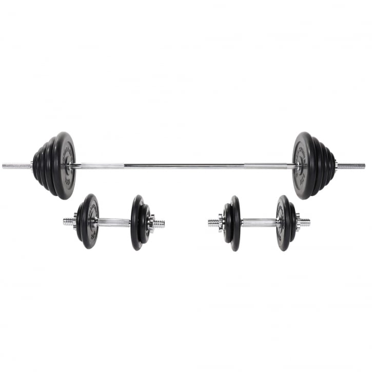Vægstangspakke med en vægtstang på 10 kg og 170 cm og to håndvægtsstænger på hver 35 cm med en samlet vægt på 5 kg.