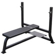 Bænkpres med sort vægtstangsstativ og sort pude, der kan klare 100 kg på stativet og 250 kg på bænken.