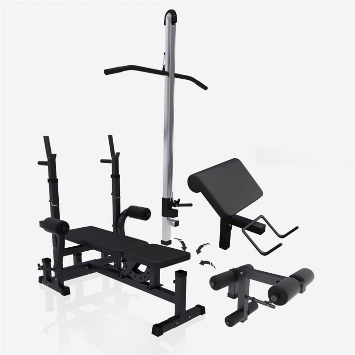 Denne multi-bænk sælges sammen med en lat pull-up station og begge er tilpasset til vægtstænger med en huldiameter på 31 mm. Kombinationen af produkter giver dig mulighed for at træne en lang række øvelser for skuldre, bryst, arme, mave, ben og ryg og er perfekt til dig med lidt plads.