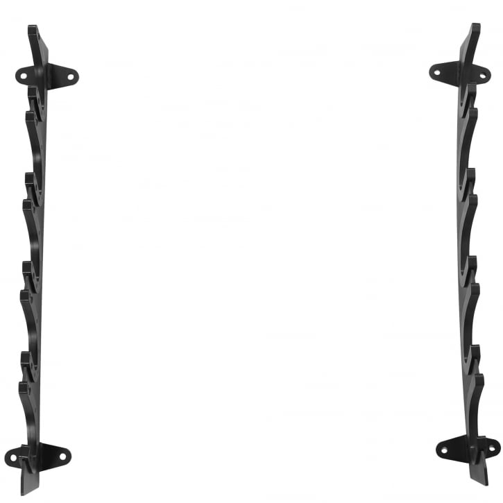 Den er let at montere og holder fem vægtstænger pænt sorteret på væggen.