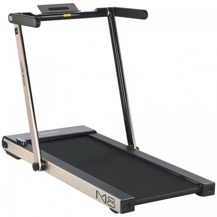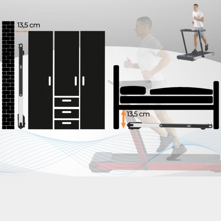 Du har ikke brug for værktøj eller teknisk forståelse for at montere M8 løbebånd. Pak ud, fold siderammen op, stram to håndhjul, fold håndlisterne - færdige. Den pæne løbebånd kan foldes så hurtigt som den kan monteres, og i foldet position kan den placeres på en høj kant eller placeres under sengen med dimensionerne 158x77x13,5 cm.