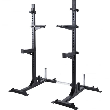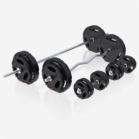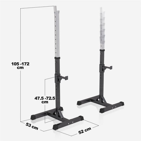 For dem, som ønsker et komplet sæt med skivstång og vægte, findes alternativer med 30 mm eller 50 mm diameter, stænger på 170 cm eller 218 cm og vægtskiver op til 30 kg. Stativet er justerbart med flere højdeindstillinger og kan klare op til 300 kg, hvilket gør det velegnet til både nybegyndere og mere erfarne brugere.
