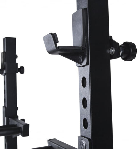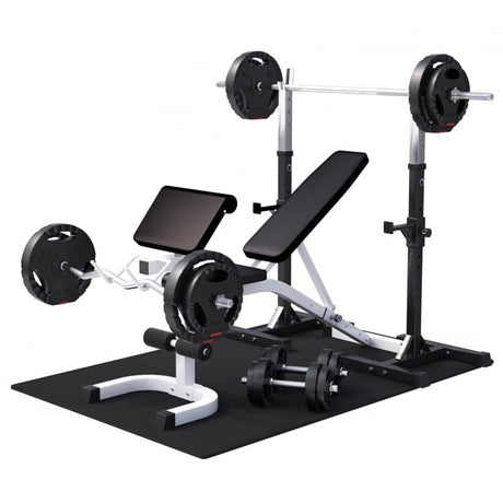 Vores sæt tilbyder flere fordele. Skivstångsstativet er robust og har flere højdeindstillinger, hvilket gør det sikkert og fleksibelt til forskellige øvelser. Indbyggede vægtholdere gør det nemt at organisere vægtskiver og holde træningsområdet ryddeligt. Med et stabilt stativ kan du løfte tunge vægte med tryghed og fokusere på teknik og præstation.