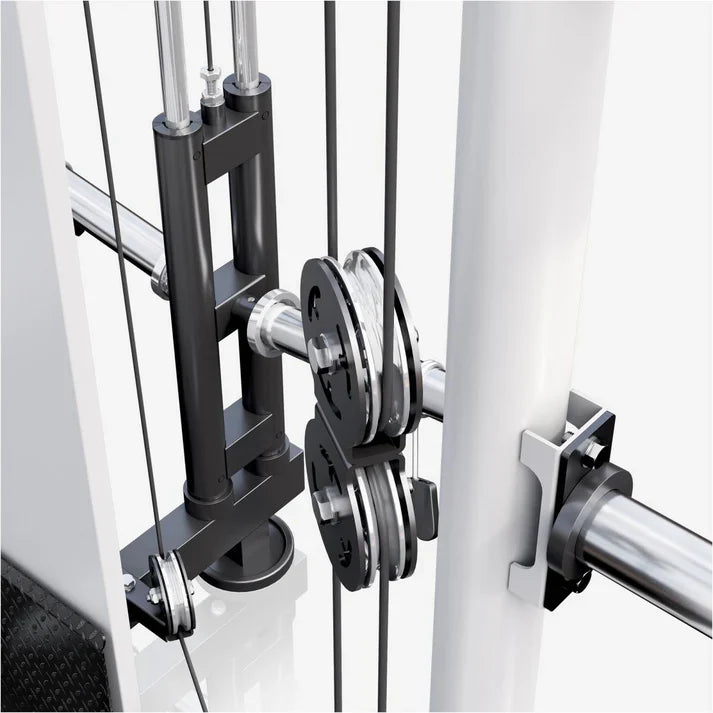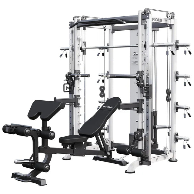 Træningsbænk og smith-maskine udstyret med højdejusterbare kabelstationer, hagestang, dip-håndtag og mulighed for at træne med fri vægtstang.