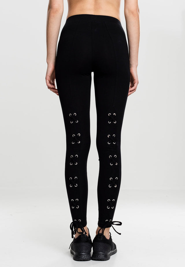 Sorte leggings er et must-have i næsten enhver garderobe. Disse leggings til kvinder skiller sig ud med deres elegante snøredetaljer på lægge og lår. De dekorative detaljer fungerer som et trendy stilskift og er især effektive, når de kombineres med farverige sneakers eller som et hot outfit med dine yndlingshøje hæle.