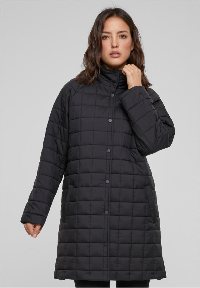 Denna kvinnors quiltade jacka har ett medelstort rutmönster med lätt vaddering som ger en subtil puffer-effekt. Raglansärmarna ger en sportig känsla, medan den höga ståkragen står för förfinad komfort. Jackan stängs med en tryckknapplista och har två praktiska sidofickor. Den är tillverkad i terylen och är fodrad med taffeta och Sherpa-material, vilket ger både värme och mjukhet. Med en bekväm och oversized passform når jackan ner till knäna.