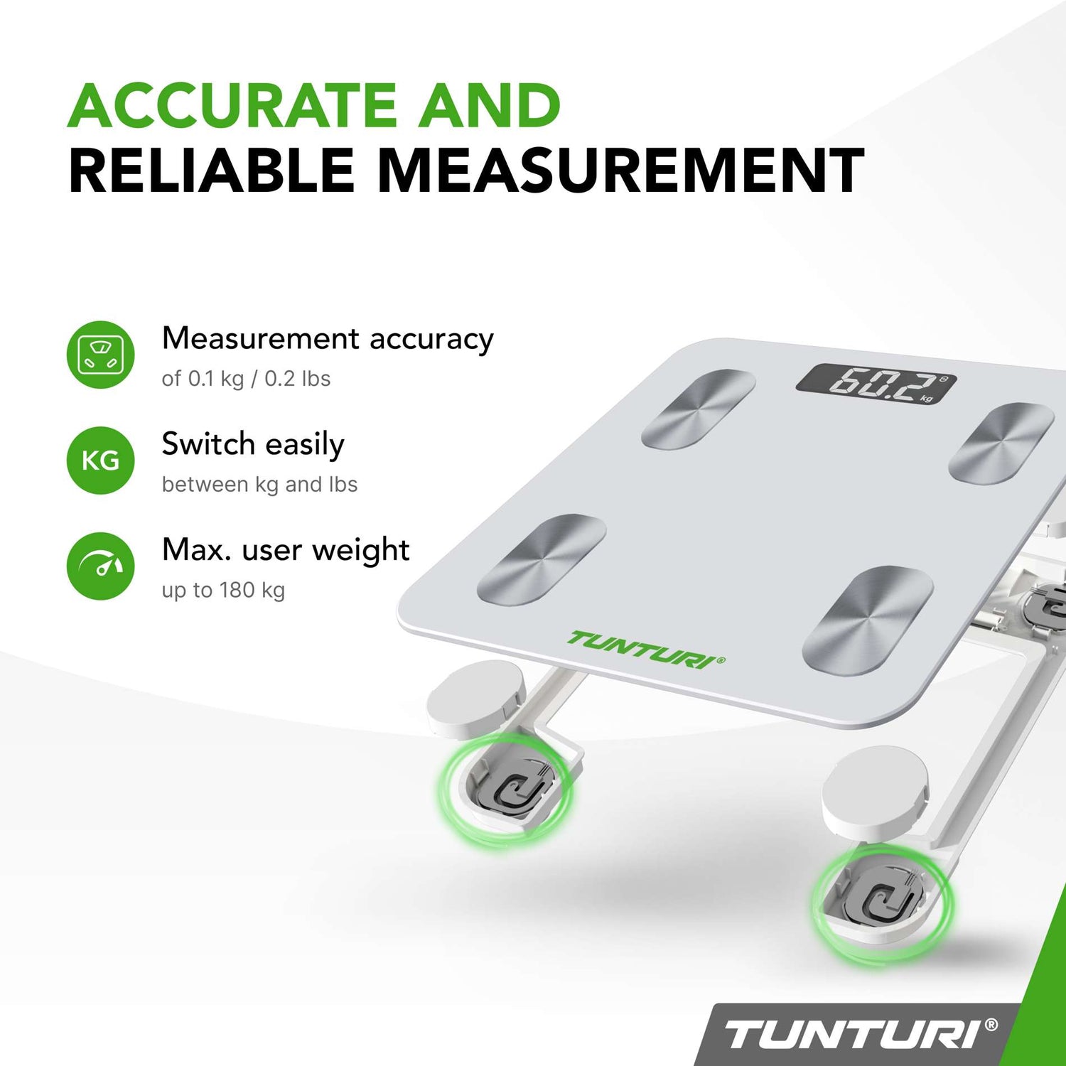 Tunturi SC30 Smart Scale mäter: vikt, kroppsmasseindex (BMI), fettprocent, muskelmassa, fettfri massa, subkutant fett, intraabdominellt fett, kroppsvätskor, skelettmuskelvikt, kroppsålder, protein, BMR, benvikt, muskelprocent.