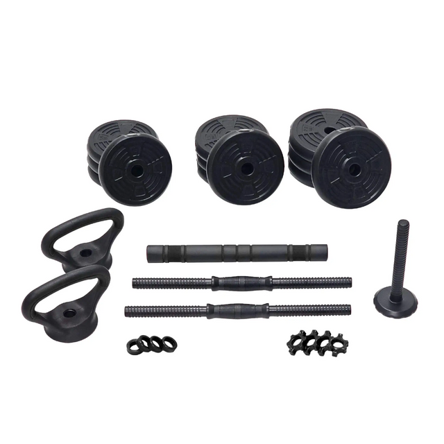 Detta 20 kg hantelset 4-i-1 erbjuder maximal mångsidighet på minimalt utrymme. Oavsett om det används som hantlar, skivstång, kettlebell eller armhävningshandtag – detta enda set täcker alla dina hemmaträningsbehov. Snabbt justerbara viktskivor med säkra låsmekanismer och halkfria handtag säkerställer en bekväm och säker träning. De slitstarka plastbelagda vikterna skyddar ditt golv och är idealiska för hemmabruk.