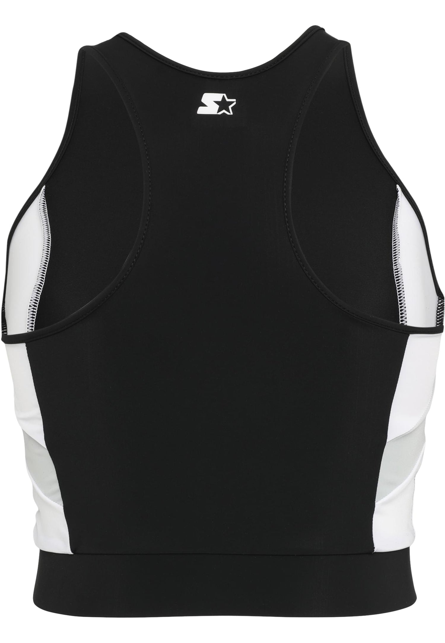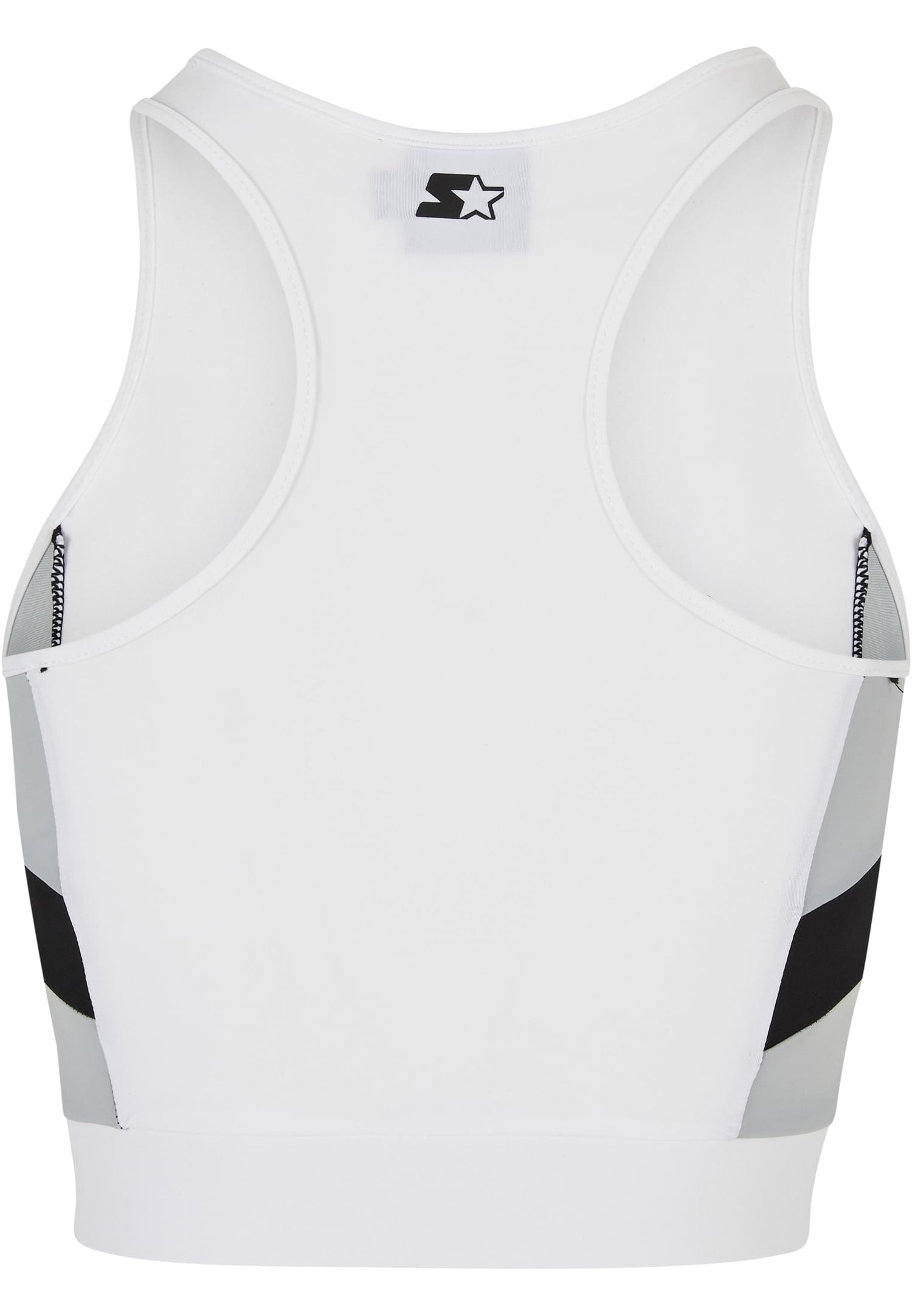 Denne sporty top til kvinder kombinerer stil og funktionalitet på bedste vis. Det stropløse racerback-design giver fuld bevægelsesfrihed, så du kan bevæge dig frit og komfortabelt. Det strækbare jerseymateriale giver en perfekt pasform og komfort hele dagen. De farvede indsatser i siderne og de små Starter-logoer rundt om halsudskæringen giver en stilfuld detalje. Toppen har et kort, sexet crop-snit, der gør den perfekt til både træning og hverdagsbrug.