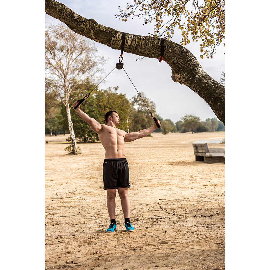 Træn på stranden, i skoven eller indendørs – alt er muligt med dette Tunturi Cross Fit Trainer-sæt. Sættet indeholder flere forskellige træningsredskaber til øvelser, der tilpasses efter din egen kropsvægt. Crossfit-udstyret kan monteres på for eksempel en dør, et træ eller en stang. De lange hovedstropper med D-ringe udgør grundlaget og kan suppleres med ringe, håndtag eller fodløkker. Du kan nemt justere længden ved at fastgøre tilbehøret på en anden D-ring. Den medfølgende remskive muliggør bevægelige ophængsøvelser.
