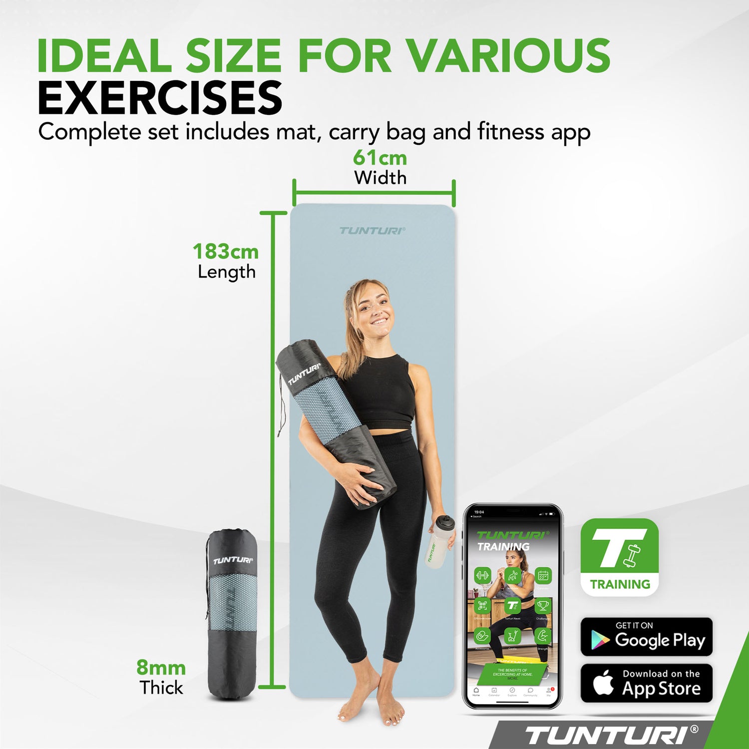 Vem tränar utan matta nuförtiden? Oavsett om du ligger ner för magövningar eller utövar yoga sittande, ger en matta extra komfort och stabilitet. Med Tunturis extra tjocka 8 mm matta har du en yogamatta, sportmatta och träningsmatta i ett. Mattan ger extra komfort, belastar muskler och leder mindre och är tillverkad av miljövänligt material.